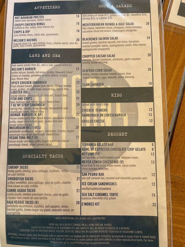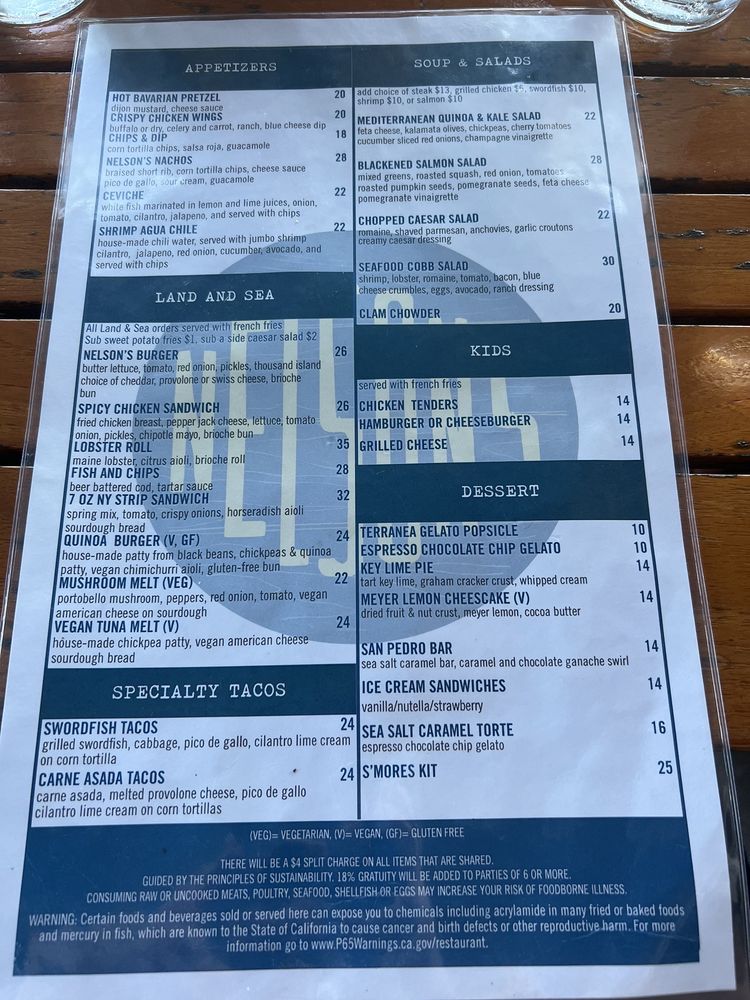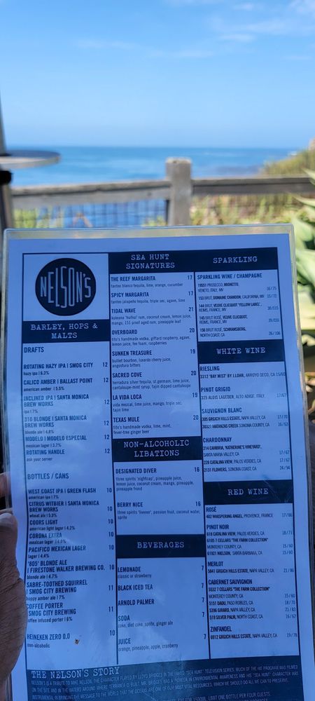 Nelson's at Terranea Resort in Rancho Palos Verdes offers a diverse menu with options for everyone. From appetizers like Chips & Dip and Ahi Poke Bowl to Land and Sea selections like Nelson's Burger and Spicy Chicken Sandwich, every dish is crafted with care. The Soups & Salads section features tantalizing options like Mediterranean Quinoa & Kale Salad and Blackened Salmon Salad. Customer reviews rave about the stunning Pacific views and friendly staff, making dining at Nelson's a memorable experience. While some may find the food to be average, the overall ambiance and service make it a worthwhile visit. The outdoor seating with ocean views, happy hour specials, and delicious cocktails add to Nelson's charm. Whether you're looking for a casual lunch spot or a place to celebrate a special occasion, Nelson's has something for everyone.